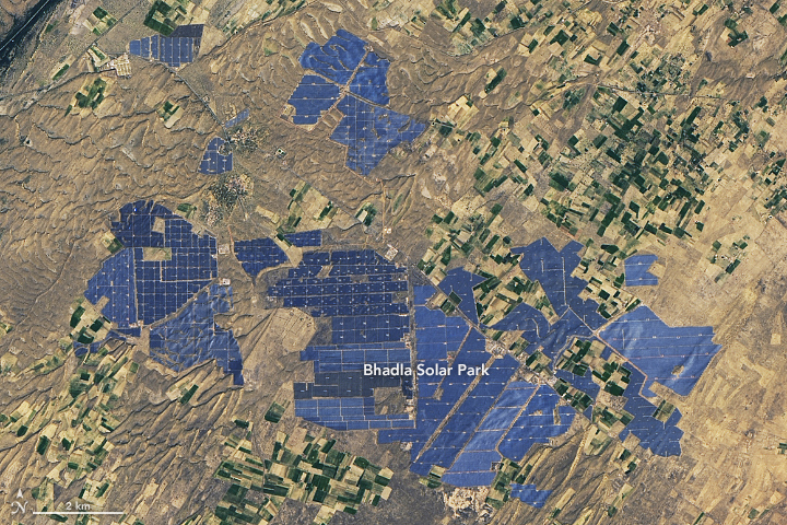 โครงการ Bhadla Solar Park ใกล้ชายแดนอินเดียกับปากีสถาน เริ่มปรากฏในภาพถ่ายดาวเทียมในปี 2558 ขณะนี้แผงโซลาร์เซลล์หลายล้านแผงปกคลุม Phalodi ทำให้ดูเสมือนพื้นโลหะบนภูมิประเทศที่ครั้งหนึ่งเคยเป็นทรายสีน้ำตาล เครื่องมือ Operational Land Imager (OLI) บน Landsat 8 จับภาพดาวเทียมสีธรรมชาติของSolar Park นี้เมื่อวันที่ 26 มกราคม 2565