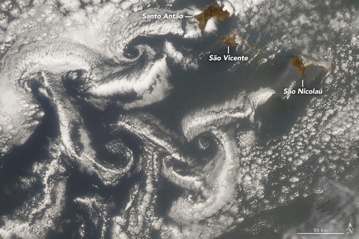 ดาวเทียมหลายดวงจับภาพฝุ่นข้ามมหาสมุทรแอตแลนติก NOAA แบ่งปันภาพที่น่าประทับใจจาก GOES-EAST เมื่อวันที่ 27 มิถุนายน 2561 เครื่องมือวัด Moderate Resolution Imaging Spectroradiometer (MODIS) บนดาวเทียม Terra และ Aqua ยังถ่ายภาพฝุ่นหลายครั้ง เมื่อวันที่ 24 มิถุนายน 2561 MODIS บน Aqua ได้ภาพด้านล่าง ซึ่งแสดงให้เห็นก้อนเมฆที่หมุนวนเป็นลวดลายที่สะดุดตาเมื่อลมพัดรอบๆ หมู่เกาะเคปเวิร์ด ฉากทั้งฉากพร่ามัวเพราะฝุ่น
