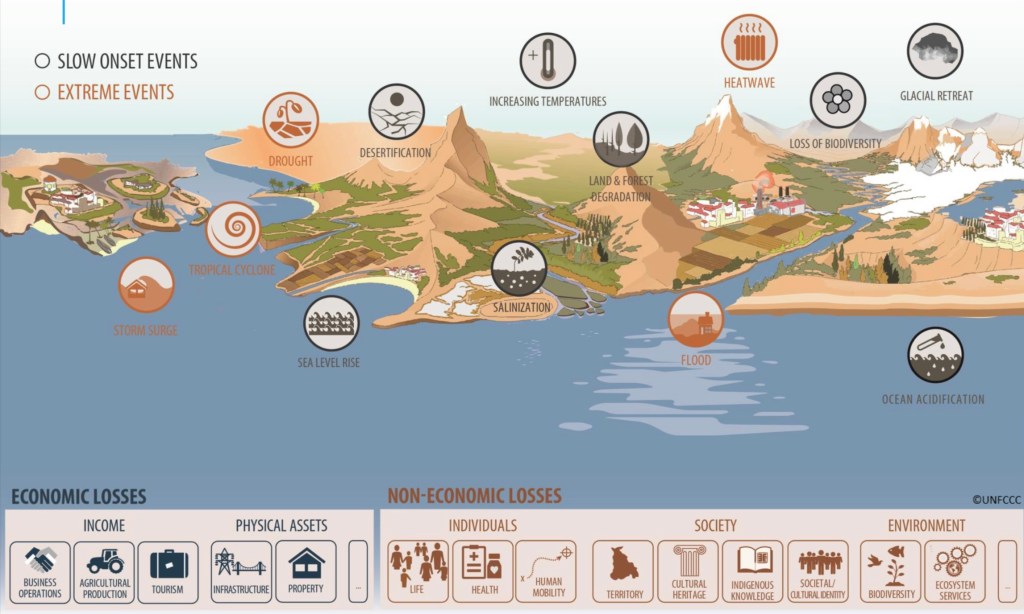 กล่าวอีกนัยหนึ่ง ผลกระทบจากวิกฤตสภาพภูมิอากาศที่เกินขอบเขตของการปรับตัว และส่งผลเสียต่อภาคส่วนต่างๆ เช่น เกษตรกรรม ป่าไม้ การประมง และการท่องเที่ยว และที่สร้างความเสียหายต่อโครงสร้างพื้นฐานและทรัพย์สินที่สำคัญ ผลกระทบเหล่านี้อาจส่งผลกระทบต่อห่วงโซ่อุปทานหรือทำให้เกิดการย้ายถิ่น การสูญหายของวัฒนธรรมและวิถีชีวิต