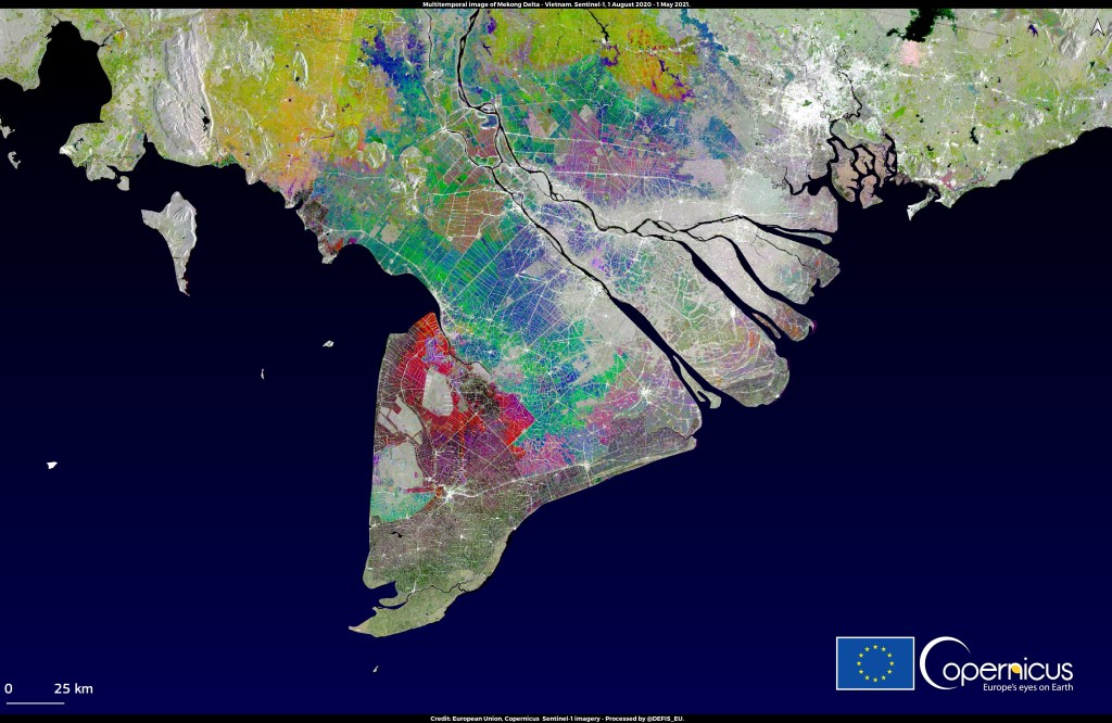 ภาพนี้บันทึกด้วยเครื่องมือเรดาร์บนดาวเทียม Copernicus Sentinel-1 ระหว่างวันที่ 1 สิงหาคม 2563 ถึง 1 พฤษภาคม 2564 ช่วยให้เราเห็นภาพการเปลี่ยนแปลงตามฤดูกาลในสามเหลี่ยมปากแม่น้ำโขงในเวียดนาม