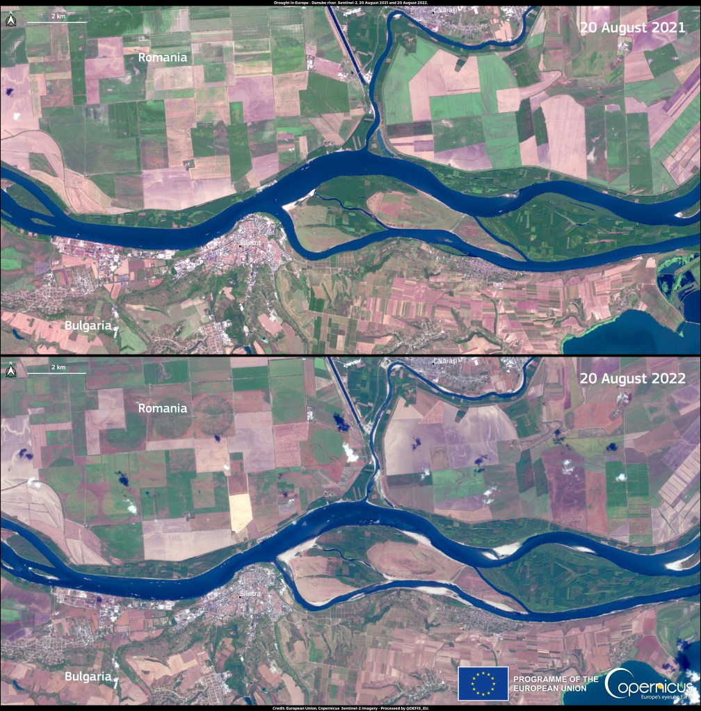 ภาพบนบันทึกด้วยเครื่องมือบนดาวเทียม Copernicus Sentinel-2A และ Sentinel-2B เมื่อวันที่ 20 สิงหาคม 2564 และ 20 สิงหาคม 2565 ตามลำดับแสดงให้เห็นถึงการขาดแคลนน้ำซึ่งส่งผลกระทบต่อแม่น้ำดานูบที่เป็นพรมแดนระหว่างบัลแกเรียและโรมาเนีย