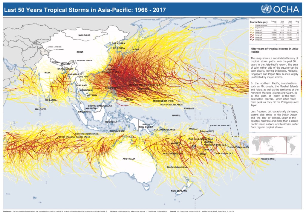 แผนแสดงเส้นทางพายุหมุนเขตร้อนทั้งหมดในช่วง 50 ปี(2509-2560)ในภูมิภาคเอเชียแปซิฟิก พื้นที่ในแนวเส้นศูนย์สูตรสามารถมองเห็นได้ชัดเจน ทำให้อินโดนีเซีย มาเลเซีย สิงคโปร์ และปาปัวนิวกินีไม่ได้รับผลกระทบจากพายุใหญ่