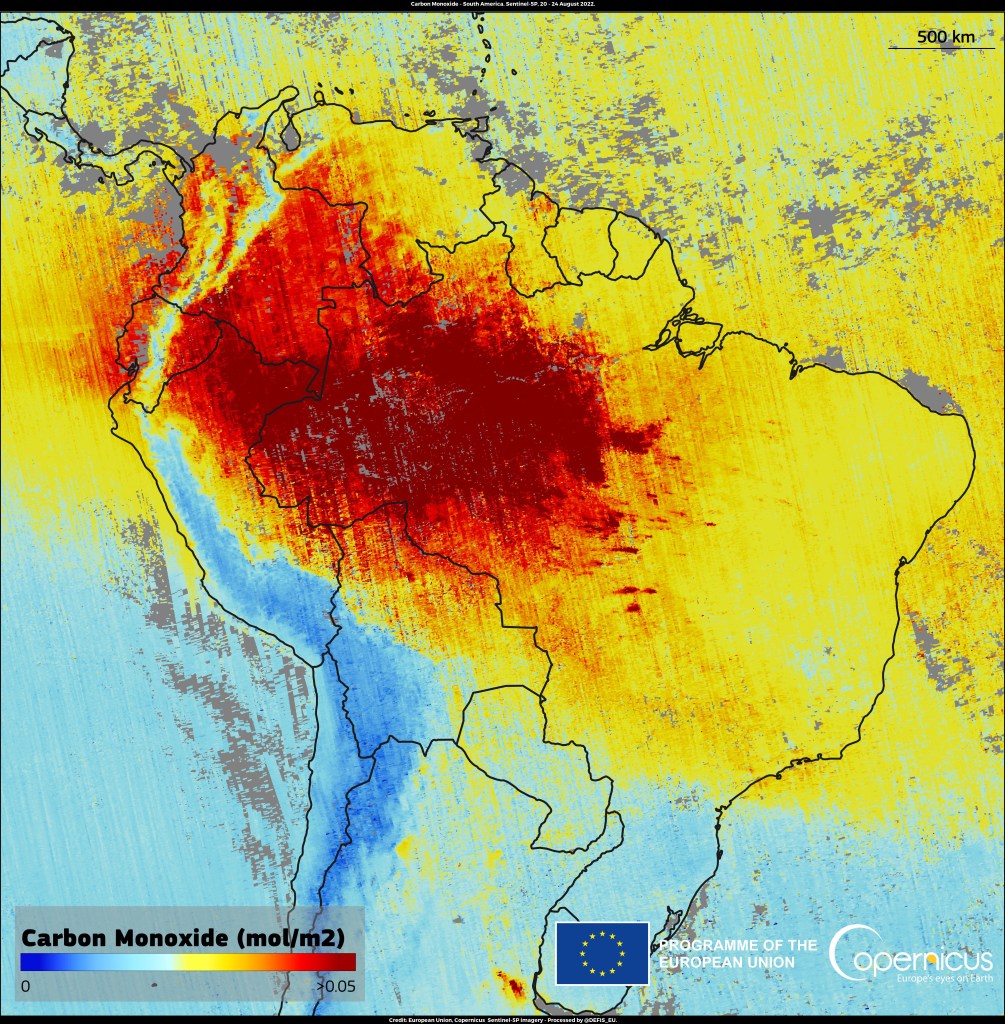 ภาพด้านบนแสดงระดับของก๊าซคาร์บอนมอนน็อกไซด์ในบรรยากาศซึ่งตรวจวัดโดยเครื่องมือวัดบนดาวเทียม Sentinel5-P ระหว่างวันที่ 20 และ 24 สิงหาคม 2565