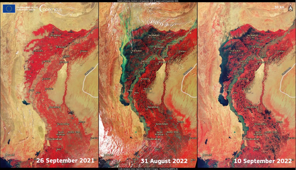 ภาพด้านบนประกอบด้วยภาพที่บันทึกโดยเครื่องมือบนดาวเทียมโคเปอร์นิคัส เซนติเนล-3 เมื่อวันที่ 26 กันยายน พ.ศ. 2564 (ก่อนเกิดอุทกภัย) วันที่ 31 สิงหาคม และ 10 กันยายน พ.ศ. 2565 (ระหว่างหายนะจากอุทกภัย) พื้นที่ส่วนใหญ่ของประเทศยังคงถูกน้ำท่วม โดยเฉพาะในแคว้นสินธุ หนึ่งในพื้นที่ที่ได้รับผลกระทบมากที่สุด