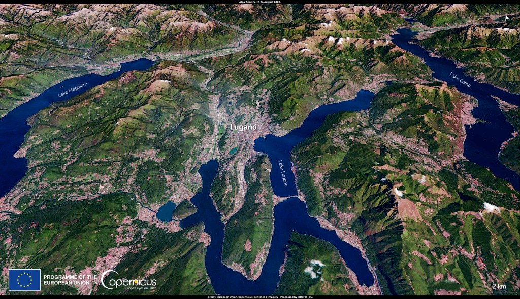 ภาพสามมิติที่ทำขึ้นจากภาพถ่ายดาวเทียมโคเปอร์นิคัส เซนติเนล-2 ในวันที่ 26 สิงหาคม พ.ศ. 2565 แสดงให้เห็นพื้นที่รอบๆ ลูกาโนในสวิตเซอร์แลนด์