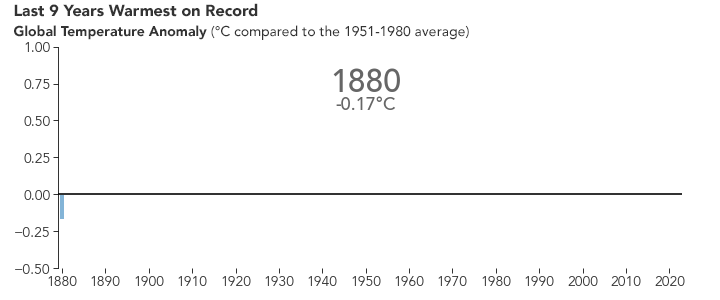 9 ปีที่ผ่านมาเป็นช่วงเวลาที่อุณหภูมิเฉลี่ยผิวโลกร้อนที่สุดนับตั้งแต่มีการบันทึกอุณหภูมิในปี 2423 ซึ่งหมายความว่าโลกในปี 2565 อุ่นขึ้นประมาณ 1.11°C (2°F) โดยเฉลี่ยเมื่อเทียบกับช่วงปลายศตวรรษที่ 19