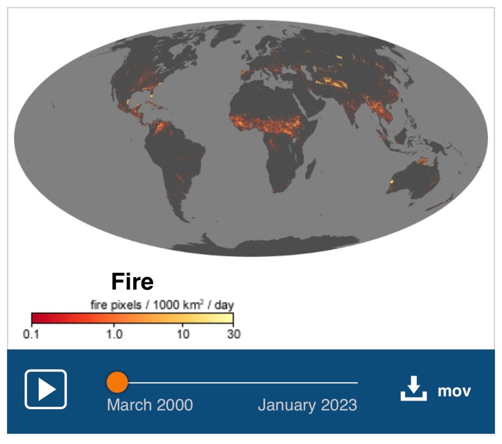 รูปแบบทั่วโลกบางส่วนที่ปรากฏในแผนที่ไฟเมื่อเวลาผ่านไปเป็นผลมาจากวัฏจักรตามธรรมชาติของปริมาณน้ำฝน ความแห้งแล้ง และฟ้าผ่า ตัวอย่างเช่น ไฟที่เกิดขึ้นตามธรรมชาติเป็นเรื่องปกติในป่าทางเหนือของแคนาดาในฤดูร้อน ในส่วนอื่นๆ ของโลก รูปแบบต่างๆ เป็นผลมาจากกิจกรรมของมนุษย์ ตัวอย่างเช่น การเผาไหม้ที่รุนแรงในใจกลางของอเมริกาใต้ตั้งแต่เดือนสิงหาคมถึงตุลาคมเป็นผลมาจากการจุดไฟโดยมนุษย์ ทั้งโดยเจตนาและโดยบังเอิญ ในป่าฝนแอมะซอนและ Cerrado (ระบบนิเวศทุ่งหญ้า/ทุ่งหญ้าสะวันนา) ทางตอนใต้ ทั่วทั้งทวีปแอฟริกา พื้นที่เผาใหม้เพื่อการเกษตรแผ่ขยายวงกว้างจากเหนือจรดใต้ทั่วทั้งทวีปเมื่อฤดูแล้งดำเนินไปในแต่ละปี การเผาเพื่อการเกษตรเกิดขึ้นในช่วงปลายฤดูหนาวและต้นฤดูแล้งของทุกปีทั่วเอเชียตะวันออกเฉียงใต้