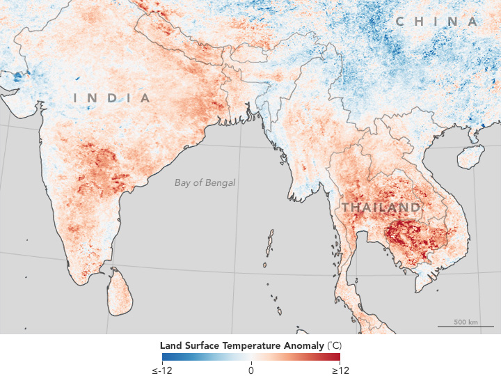 ภาพด้านบนจากเครื่องมือบนดาวเทียม Terra ของ NASA แสดงค่าเบี่ยงเบนจากค่าเฉลี่ยของอุณหภูมิพื้นผิวในไทยและอินเดียในเดือนเมษายน 2559 ดังที่เราเห็น ประเทศไทยประสบกับความร้อนสูงขึ้น 12°C มากกว่าค่าเฉลี่ยในพื้นที่ส่วนใหญ่ และมีการทำลายสถิติอุณหภูมิรายวันมากกว่า 50 ครั้ง (สูงสุดคือ 44.6°C ที่แม่ฮ่องสอน)
