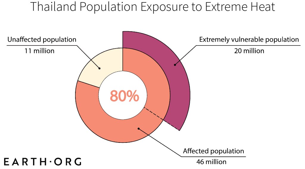 ในขณะนี้ อุณหภูมิเฉลี่ยทั้งปีของประเทศไทยอยู่ที่ 26°C การศึกษาที่เผยแพร่ในปี 2563 “Future of the human niche” (Xu et al. 2020) คาดการณ์ว่าอุณหภูมิเฉลี่ยทั้งปีของประเทศไทยจะเท่ากับของทะเลทรายซาฮาราภายในปี 2613 โดยสูงกว่า 29°C คลื่นความร้อนที่เบาที่สุดในช่วงปีดังกล่าวจะเทียบได้กับคลื่นความร้อนที่รุนแรงที่สุดในปัจจุบัน และทำให้ประเทศไทยร้อนเกินกว่าที่จะอาศัยอยู่ได้ตลอดทั้งปี