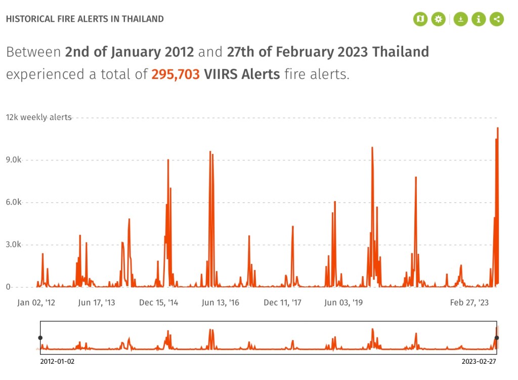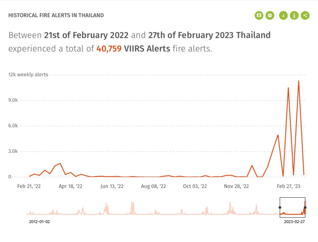 การตรวจจับจุดความร้อนโดยเซ็นเซอร์ VIIRS บนดาวเทียม และนำมาวิเคราะห์ผ่านอัลกอริธึมของ global Forest Watch ระบุว่า ระหว่างวันที่ 2 มกราคม 2555 จนถึงวันที่ 27 กุมภาพันธ์ 2566 มีจุดความร้อนในพื้นที่ประเทศไทยรวมกันทั้งสิ้น 295,703 จุด