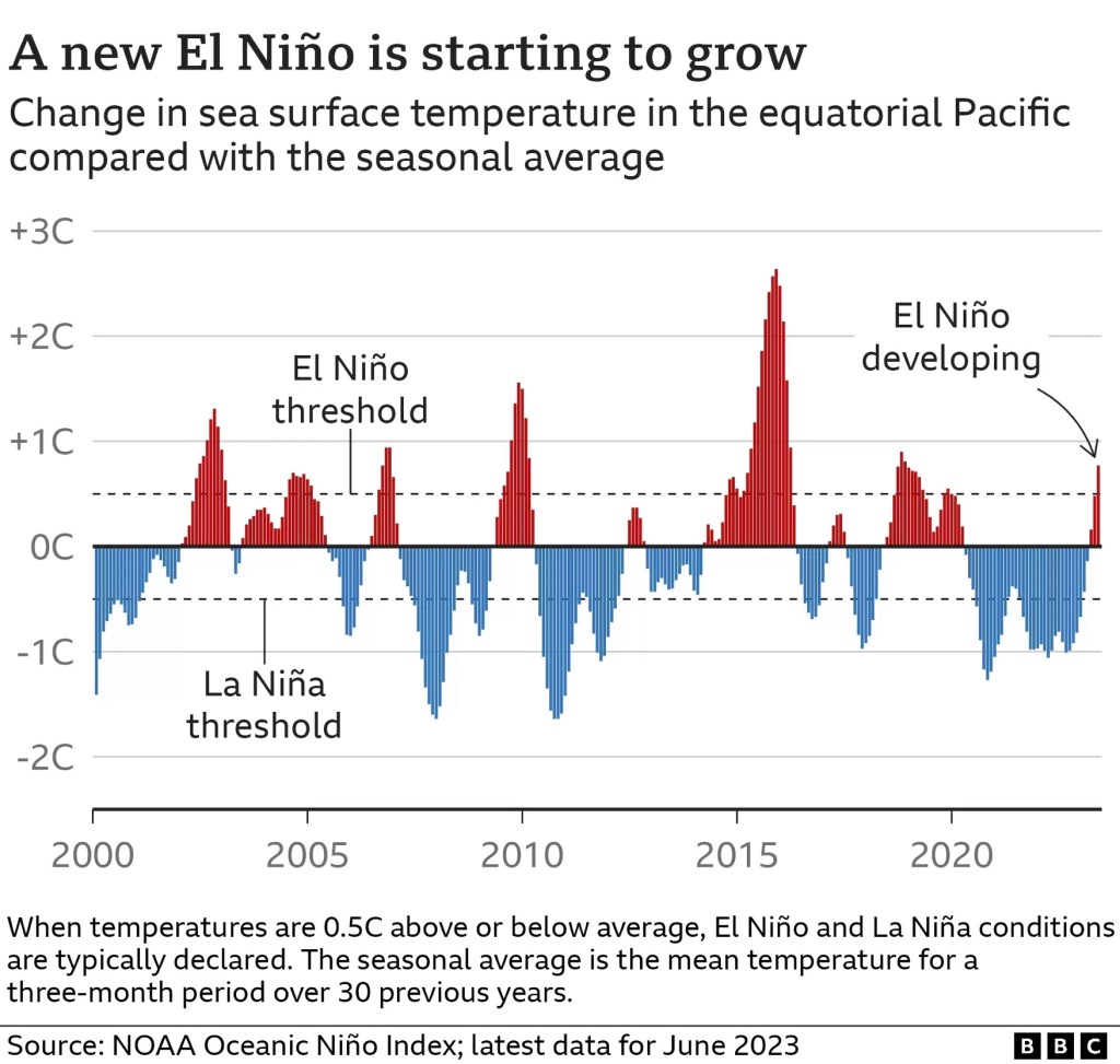 เอลนีโญกำลังเกิดขึ้นอีกครั้ง แต่นักวิทยาศาสตร์กล่าวว่ายังมีกำลังอ่อน หมายความว่าอุณหภูมิของมหาสมุทรคาดว่าจะสูงขึ้นอีกโดยสูงกว่าค่าเฉลี่ยในอีกไม่กี่เดือนข้างหน้า