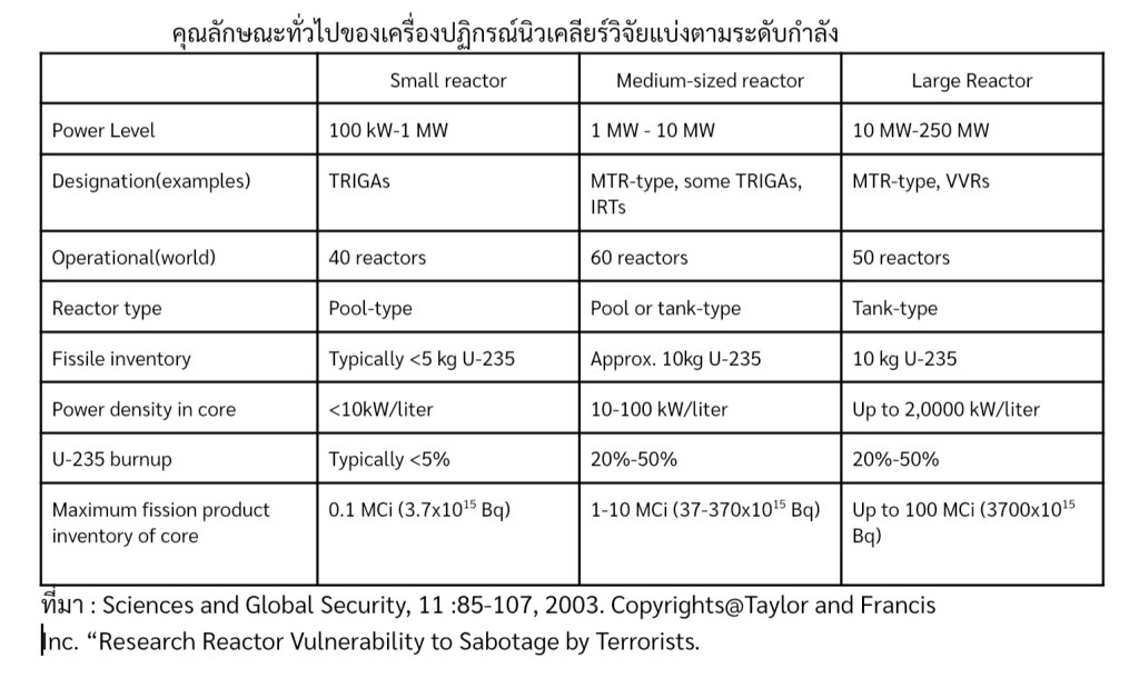 “อุบัติการณ์ทางนิวเคลียร์จากเครื่องปฏิกรณ์เกิดขึ้นได้จริงและเกิดขึ้นหลายครั้ง มีความสูญเสียจำนวนมาก ทั้งชีวิตและทรัพย์สิน แต่เกิดกับเตาปฏิกรณ์พลังงานที่ ร้ายแรงถึงระดับ INES rate สูงสุดมีเพียง 2 ครั้งคือ ฟุกุชิมะ ญี่ปุ่น และเชอร์โนบิล รัสเซีย(ปัจจุบันยูเครน) ส่วนเครื่องปฏิกรณ์นิวเคลียร์วิจัย ไม่พบข้อมูลในอดีต ที่ระบุว่ามีอุบัติภัยร้ายแรงเกิดขึ้น” (หน้า 5-190)