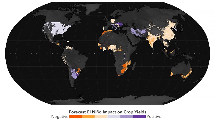 เหตุการณ์เอลนีโญในปีนี้ซึ่งจะรุนแรงขึ้นต่อเนื่องจนถึงสิ้นปี 2566 ก่อนที่จะคลี่คลายไปในกลางปี 2567 คาดว่าจะมีส่วนทำให้เกิดความไม่มั่นคงด้านอาหารในระดับสูงในบางภูมิภาค แผนที่ด้านบนพัฒนาโดยพันธมิตรของ FEWS NET แสดงให้เห็นผลกระทบที่คาดการณ์ไว้ของปรากฏการณ์เอลนีโญต่อพืชผลสินค้าโภคภัณฑ์ที่สำคัญ รวมถึงข้าวสาลี ข้าวโพด (ข้าวโพด) ข้าว ถั่วเหลือง และข้าวฟ่าง แผนที่นี้อิงจากการวิเคราะห์ผลผลิตพืชผลในอดีตและข้อมูลสภาพภูมิอากาศระหว่างปี ค.ศ. 1961 ถึง 2020 นักวิทยาศาสตร์จาก NASA Harvest และศูนย์การบินอวกาศก็อดดาร์ดของ NASA/ NOAA/มหาวิทยาลัยแมริแลนด์ และศูนย์วิจัยด้านความเสี่ยงของสภาพภูมิอากาศของมหาวิทยาลัยแคลิฟอร์เนีย ซานตา บาร์บารา มีส่วนในการพัฒนาแผนที่