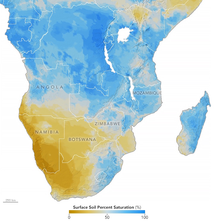 แผนที่ด้านบนแสดงการคาดการณ์สภาพความชื้นในดินทางตอนใต้ของแอฟริกาในเดือนธันวาคม 2566 ซึ่งจัดทำโดย FEWS NET Land Data Assimilation System ซึ่งใช้ชุดข้อมูลเชิงสังเกตและการพยากรณ์สภาพภูมิอากาศตามฤดูกาลเพื่อคาดการณ์สภาวะทางอุทกวิทยาที่เกี่ยวข้องกับความมั่นคงด้านอาหารในแอฟริกาทุกเดือน และตะวันออกกลาง พยากรณ์สภาพอากาศแห้งในเดือนธันวาคมในพื้นที่บางส่วนของแองโกลา นามิเบีย บอตสวานา ซิมบับเว และโมซัมบิก การคาดการณ์ความชื้นในดินเหล่านี้ช่วยให้นักวิเคราะห์สามารถติดตามว่าปรากฏการณ์เอลนีโญในปัจจุบันและผลกระทบที่มีต่อพืชผลมีการพัฒนาไปอย่างไรเมื่อเทียบกับการคาดการณ์