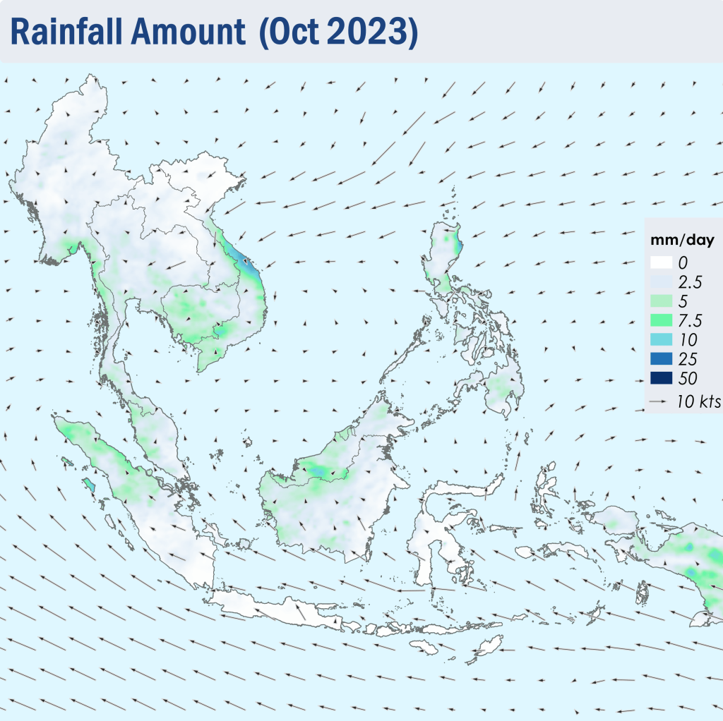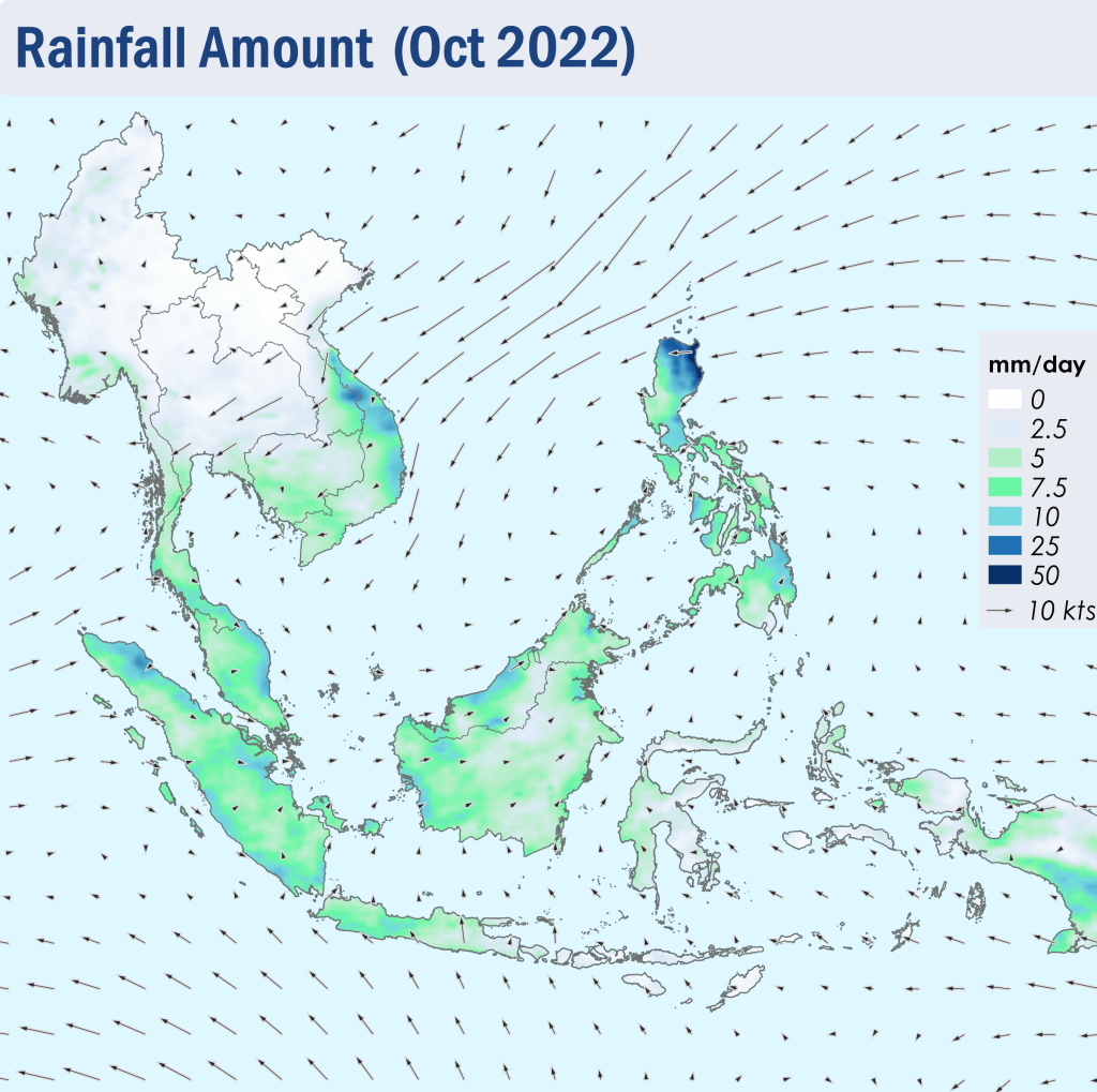 สภาวะฝนปกคลุมพื้นที่ส่วนใหญ่ของภูมิภาคอาเซียนในเดือนตุลาคม 2565 ยกเว้นบางส่วนของอนุภูมิภาคลุ่มน้ำโขงตะวันออกเฉียงเหนือ ในสัปดาห์ที่ 3 ของเดือนตุลาคม พายุไต้ฝุ่นเนสาดขึ้นฝั่งในฟิลิปปินส์ และส่งผลให้มีฝนตกหนักทางตอนเหนือของประเทศ และยังทำให้มีฝนตกเพิ่มขึ้นทั่วภาคกลางของเวียดนาม ผลจากการที่พายุอ่อนกำลังลงเป็นพายุดีเปรสชันเขตร้อนก่อนขึ้นฝั่ง (รูปที่ 3) ภูมิภาคอาเซียนตอนใต้เผชิญกับสภาพฝนชุกอย่างต่อเนื่อง และมีการออกการแจ้งเตือนระดับ 0 สำหรับภูมิภาคเมื่อวันที่ 12 ตุลาคม 2565