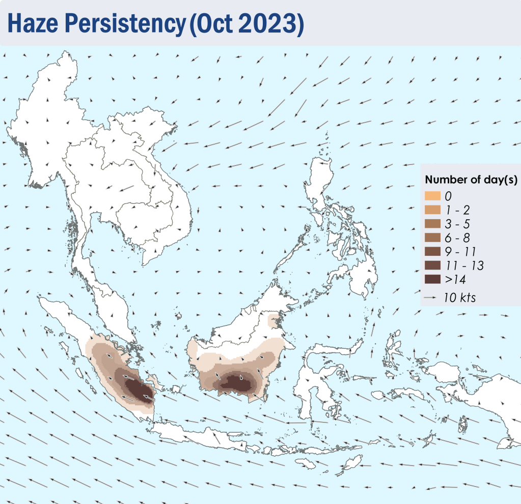 สภาพอากาศแห้งยังคงมีให้เห็นในพื้นที่ส่วนใหญ่ของภูมิภาคอาเซียนตอนใต้ในช่วงครึ่งแรกของเดือนตุลาคม 2566 โดยพบหมอกควันปานกลางถึงหนาทึบเป็นส่วนใหญ่ทางตอนใต้และตอนกลางของเกาะสุมาตรา รวมไปถึงตอนใต้และตอนกลางของกาลิมันตัน