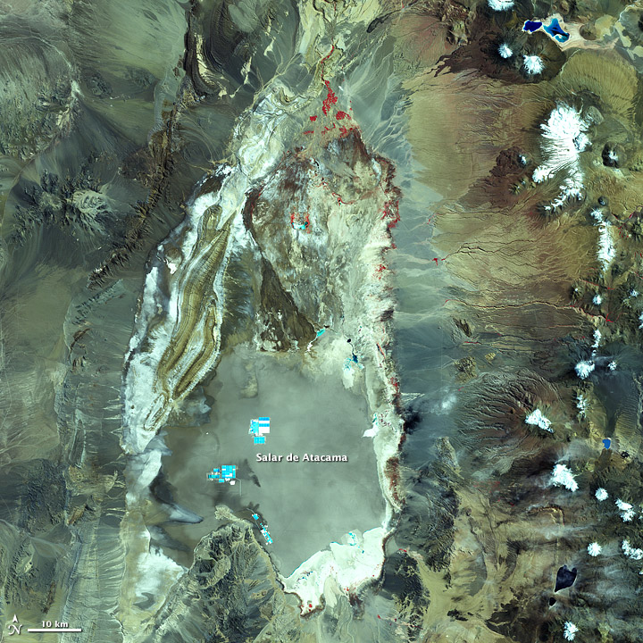 ไม่น่าแปลกใจเลยที่ Salar de Atacama ถูกขุดเพื่อเกลือ และบ่อระเหยจะปรากฏขึ้นตรงกลางของกระทะเกลือ ซึ่งเป็นรูปทรงสี่เหลี่ยมของสีฟ้าครามและสีขาวสดใส แฟลตเกลือยังมีศักยภาพในการผลิตลิเธียมจากน้ําที่มีน้ําเกลือใต้ผิวดิน