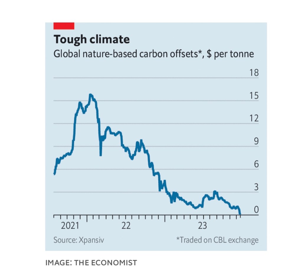 เรื่องอื้อฉาวยังทําให้ความสนใจของนักลงทุนลดลง รายงานโดย เดอะการ์เดียน หนังสือพิมพ์อังกฤษ ชี้ว่า โครงการชดเชยคาร์บอนภาคป่าไม้ชั้นนําจํานวนมากซึ่งอ้างว่าพยายามฟื้นฟูป่านั้นล้มเหลว นักกิจกรรมเคลื่อนไหวโต้แย้งว่า กลุ่มนายหน้าได้ผลประโยชน์ แต่กลุ่มชนพื้นเมืองต้องสูญเสีย ราคาคาร์บอนจากโครงการชดเชยคาร์บอนภาคป่าไม้ลดลงจาก 15 ดอลลาร์ต่อตันหลังจากการประชุมสุดยอดสภาพภูมิอากาศโลกที่กลาสโกว์(COP26) เหลือเพียง 0.10 ดอลลาร์ต่อตันหลังจากการประชุมสุดยอดสภาพภูมิอากาศล่าสุด(COP28)ที่นครดูไบ จากข้อมูลของ Xpansiv ซึ่งเป็นตลาดแลกเปลี่ยนเงินตรา