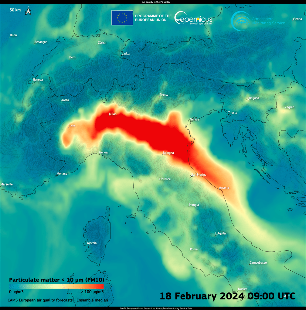 ในลุ่มแม่น้ำโป (Po Valley) ระดับมลพิษทางอากาศเข้าขั้นวิกฤติและเกินเกณฑ์มาตรฐาน ดังที่แสดงในภาพนี้โดยอิงจากข้อมูลจากหน่วยบริการตรวจสอบบรรยากาศโคเปอร์นิคัส ฝุ่น PM10 เกิน 100 ไมโครกรัม/ลูกบาศก์เมตรในหลายพื้นที่ของเขตลุ่มแม่น้ำโปรวมถึงเมืองมิลาน เมื่อวันที่ 18 กุมภาพันธ์ 2567