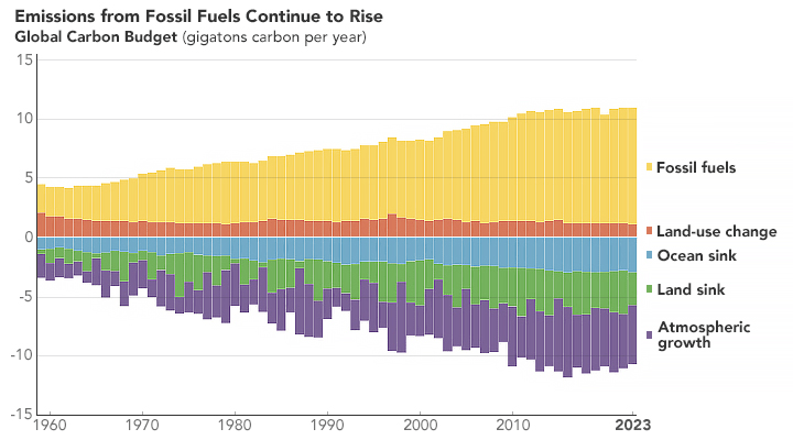 แผนภูมิด้านบนแสดงองค์ประกอบรวมของวัฏจักรคาร์บอนทั่วโลกตั้งแต่ปี 2503 ถึง 2566 แสดงให้เห็นว่าคาร์บอนถูกปล่อยออกมาจากเชื้อเพลิงฟอสซิล (สีเหลือง) และการเปลี่ยนแปลงการใช้ที่ดิน (สีส้ม) มากแค่ไหน และบรรยากาศ (สีม่วง) มหาสมุทร (สีน้ําเงิน) หรือแผ่นดิน (สีเขียว) ดูดซับคาร์บอนในสัดส่วนมากน้อยเพียงใด