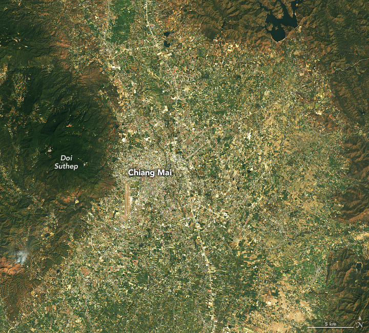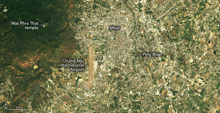 หลายครั้งในปี 2567 เชียงใหม่ติดอันดับเมืองใหญ่ที่มีมลพิษมากที่สุดในโลกโดยบริษัทเทคโนโลยีของสวิส IQAir ตามรายงานจาก The Straits Times และ Bangkok Post ภาพรายละเอียดด้านล่างซึ่งได้มาจาก OLI บน Landsat 8 แสดงให้เห็นฝุ่นควันที่ปกคลุมเมืองในวันที่ 15 มีนาคม 2567 ซึ่งเป็นหนึ่งในวันที่เซ็นเซอร์ภาคพื้นดินของกรมควบคุมมลพิษวัดระดับอนุภาคในอากาศที่พุ่งสูงขึ้น สถานี NASA AERONET ในเชียงใหม่ ซึ่งเป็นหนึ่งในเซ็นเซอร์ตรวจสอบอากาศหลายแห่งในประเทศไทย สังเกตเห็นการเพิ่มขึ้นอย่างรวดเร็วของอนุภาคอีกด้วย
