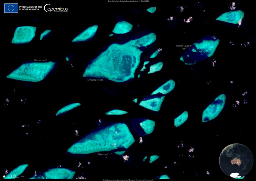 หมู่ปะการังนอกชายฝั่งควีนส์แลนด์ ซึ่งเป็นหนึ่งในพื้นที่ที่ได้รับผลกระทบมากที่สุด สามารถมองเห็นได้ในภาพ Copernicus Sentinel-2 บันทึกได้เมื่อวันที่ 3 เมษายน