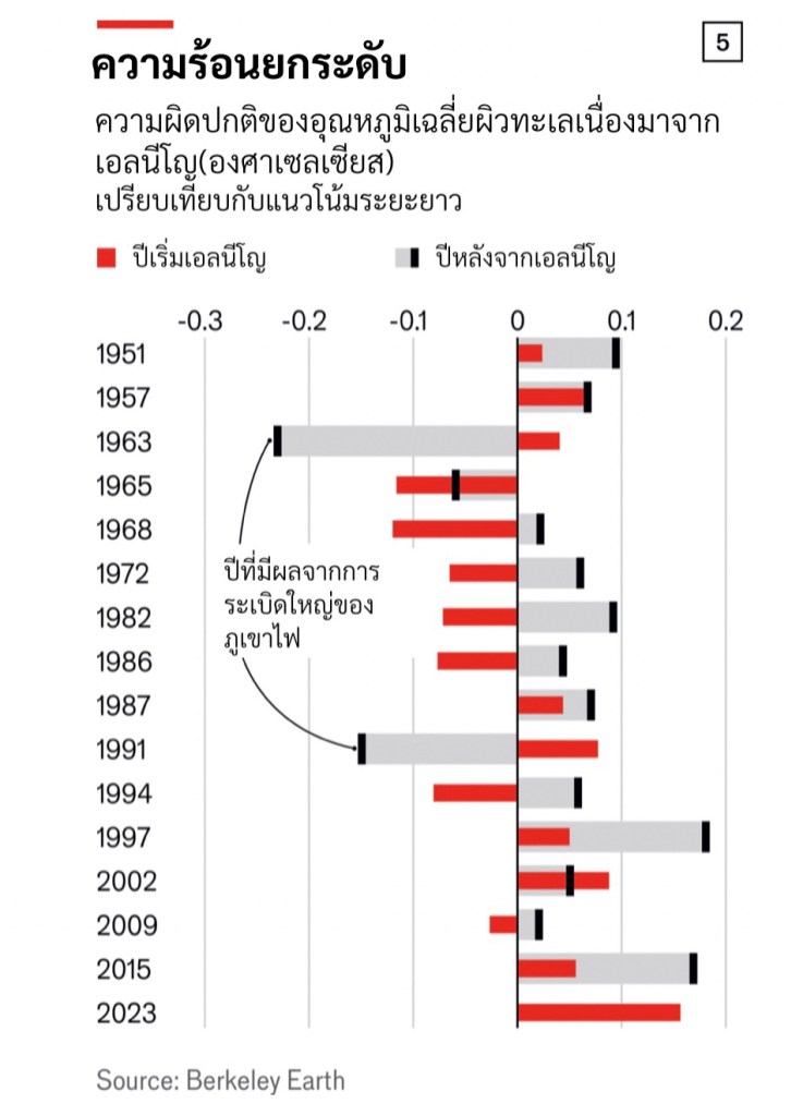 หากเอลนีโญในปี 2566 เป็นปัจจัยสําคัญต่ออุณหภูมิอากาศและผิวทะเล ปี 2567 อาจจะรุนแรงยิ่งขึ้นไปอีก นับตั้งแต่ปี 2494 อุณหภูมิอากาศร้อนขึ้นอย่างมากในปีหลังจากที่มีเอลนีโญ (ดูแผนภูมิ 5) (ยกเว้นในปี ค.ศ.1963 และ 1991 ที่เกิดการปะทุครั้งใหญ่ของภูเขาไฟทําให้อุณหภูมิลดลงเนื่องจากเขม่าและอนุภาค)