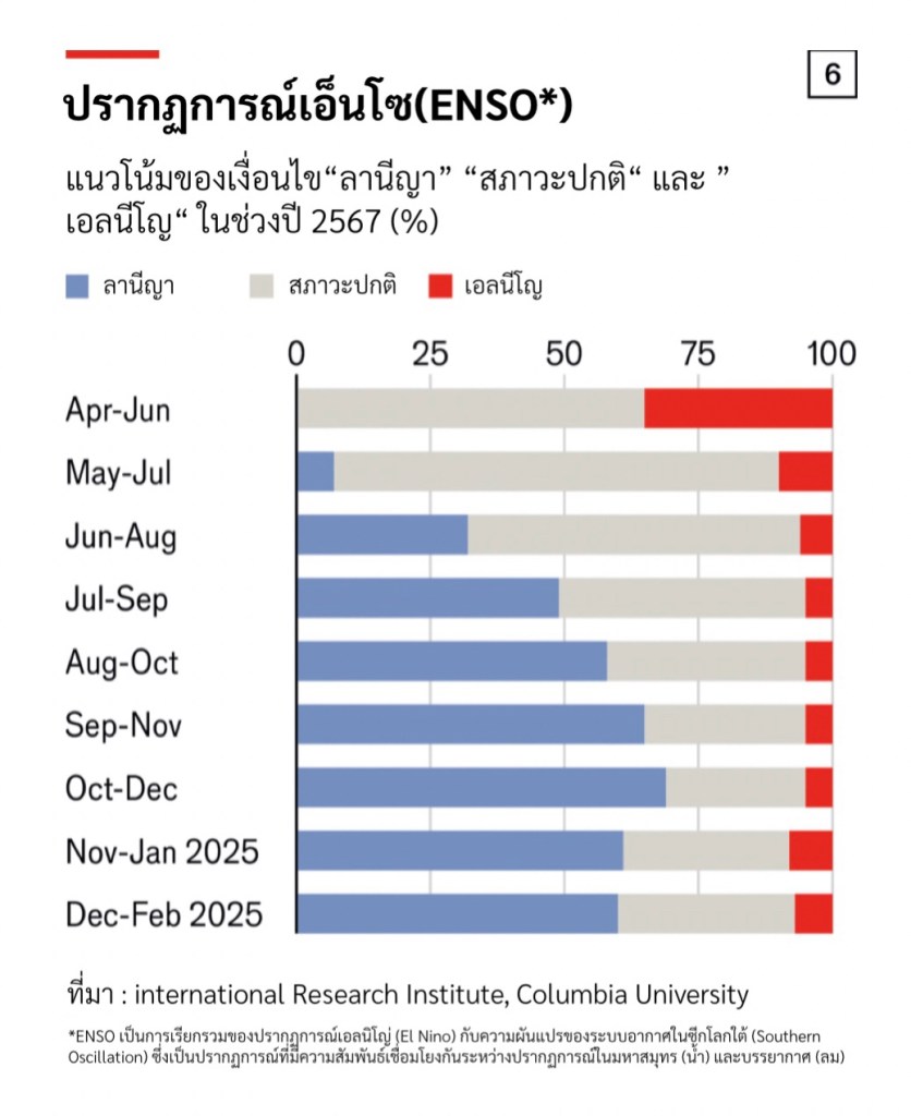 ไม่ว่าปี 2567 จะยังคงทําลายสถิติต่อไปหรือไม่ ส่วนหนึ่งจะถูกกําหนดโดยวงจร ENSO ถัดไป ในเดือนเมษายน สํานักอุตุนิยมวิทยาของออสเตรเลียประกาศว่ามหาสมุทรแปซิฟิกกําลังเย็นลงอย่างมาก ซึ่งโดยทั่วไปแล้วเป็นสัญญาณว่าเอลนีโญกําลังจะออกไป แบบจําลองการคาดการณ์ชี้ให้เห็นถึงการเปลี่ยนแปลงที่ใกล้เข้ามาไปสู่ขั้นตอนที่เป็นกลาง และคาดการณ์ว่าโลกมีแนวโน้มที่จะเข้าสู่ La Niña (รูปแบบที่เย็นกว่า) ระหว่างเดือนกรกฎาคมถึงกันยายน (ดูแผนภูมิ 6) นั่นควรเริ่มทําให้อุณหภูมิลดลงในช่วงปลายปี