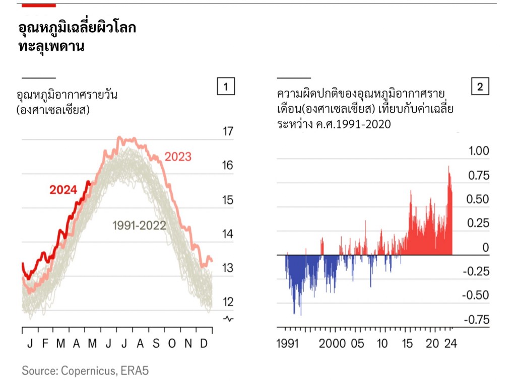 เรียบเรียงจาก Six charts help to explain 2024’s freakish temperatures https://www.economist.com/graphic-detail/2024/05/15/six-charts-help-to-explain-2024s-freakish-temperatures from The Economist