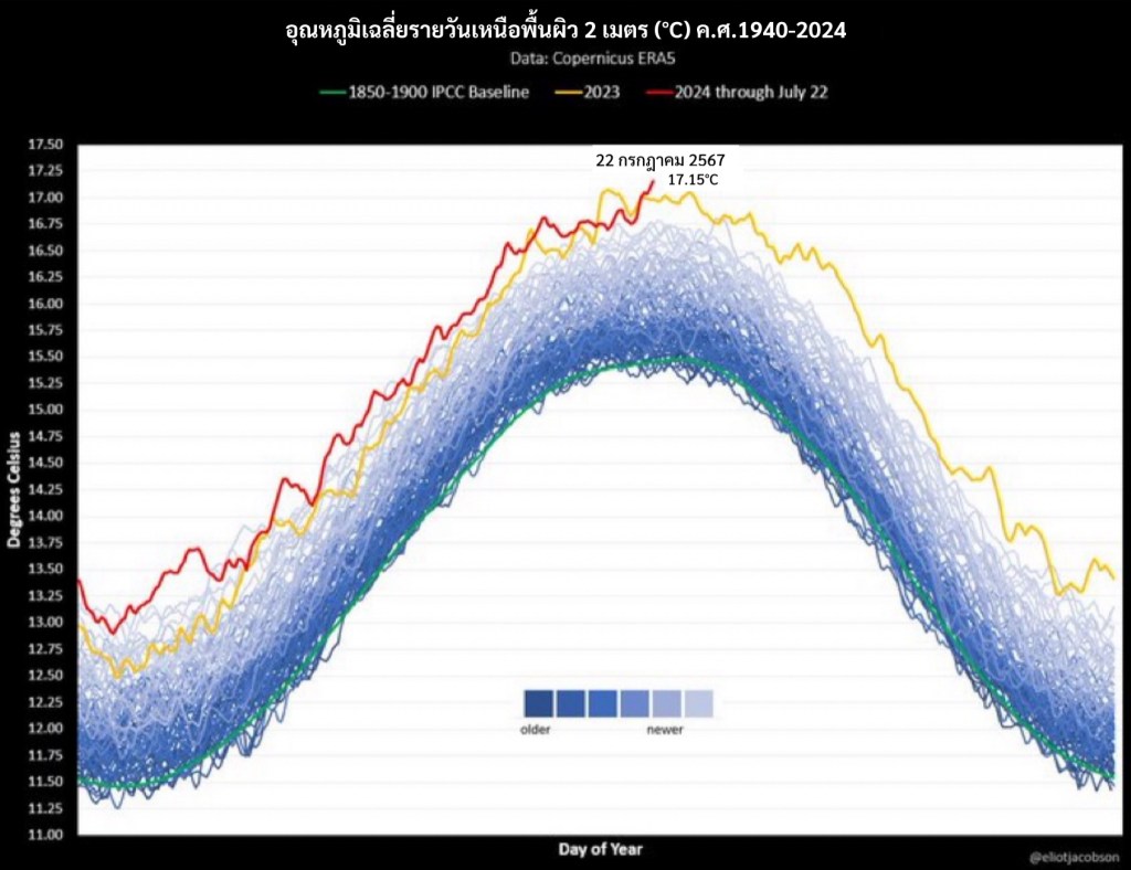 ถัดมาในวันที่ 22 กรกฎาคม 2567 ข้อมูลเบื้องต้นโดย Copernicus Climate Change Service ระบุ อุณหภูมิอากาศพื้นผิวเฉลี่ยรายวันอยู่ที่ระดับ 17.15C ทุบสถิติที่ผ่านมาทั้งหมด