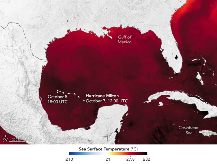 แผนที่ด้านบนแสดงอุณหภูมิผิวน้ําทะเลในวันที่ 6 ตุลาคม โดยใช้ข้อมูลจากโครงการวิจัยและการเปลี่ยนแปลงระยะสั้น (SPoRT) ที่ศูนย์การบินอวกาศมาร์แชลล์ของ NASA อุณหภูมิพื้นผิวทะเลที่สูงกว่า 82 องศาฟาเรนไฮต์ (27.8 องศาเซลเซียส) ซึ่งเป็นเงื่อนไขสำคัญที่ช่วยรักษาและขยายระดับความรุนแรงของพายุเฮอริเคนนั้นจะแสดงในสีแดงเข้ม แผนที่ด้านขวาถูกซ้อนทับด้วยข้อมูลอุณหภูมิความสว่าง ซึ่งได้มาโดยเครื่องมือ VIIRS (Visible Infrared Imaging Radiometer Suite) บนดาวเทียม NOAA-21 ในช่วงเช้าของวันที่ 7 ตุลาคม เพื่อแสดงตําแหน่งของกลุ่มเมฆพายุเฮอริเคน Milton