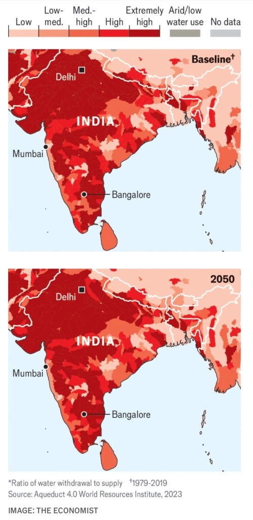ในบรรดาภัยคุกคามต่อการดำรงชีวิตในอินเดียที่เลวร้ายลงจากการเปลี่ยนแปลงสภาพภูมิอากาศ ปัญหาการขาดแคลนน้ำดูเหมือนจะเร่งด่วนที่สุด อินเดียมีประชากร 18% ของโลก แต่มีน้ำจืดเพียง 4% ของโลก และ 17 จาก 28 รัฐต้องเผชิญกับความเครียดทางน้ำในระดับ “สูง” หรือ “สูงมาก” ตามรายงานของ WRI ปัญหานี้มีแนวโน้มเลวร้ายลงในศูนย์ประชากร เช่น บังกาลอร์ เมืองหลวงด้านเทคโนโลยีของอินเดีย เมืองเกือบทั้งหมดในอินเดียพึ่งพาวิศวกรรมที่มีต้นทุนสูงในการนำน้ำจืดจากแหล่งไกล ๆ ซึ่งอาจ “หมดไปโดยสิ้นเชิง” หากการอนุรักษ์ไม่ดีขึ้น ตามรายงานของ Centre for Science and Environment (CSE) ซึ่งเป็นองค์กรคิดในเดลี