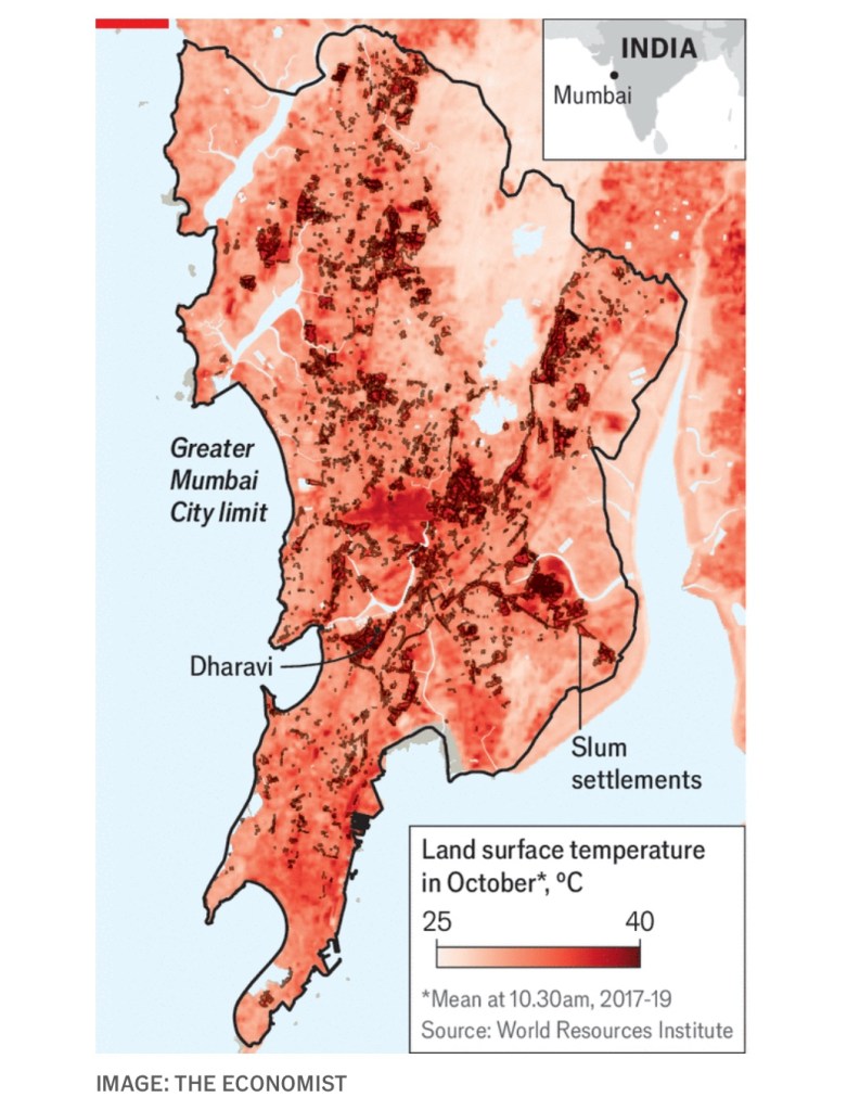 ปัญหานี้รุนแรงที่สุดในเขตเมือง ซึ่งคนยากจนต้องอาศัยอยู่ในพื้นที่แออัดใต้หลังคาสังกะสี หลายคนดำเนินธุรกิจขนาดเล็กจากบ้าน เช่น การทอดของขายหรือใช้งานเครื่องจักรที่ยิ่งเพิ่มความร้อน พื้นที่ชุมชนแออัดมีอุณหภูมิสูงกว่าพื้นที่ของคนมีฐานะซึ่งมีร่มเงาและพื้นที่เปิดโล่งมากกว่า ตัวอย่างเช่น ในเดือนตุลาคม อุณหภูมิในชุมชนแออัดดาราวีของมุมไบ ซึ่งมีประชากร 1 ล้านคนในพื้นที่เพียง 2.4 ตารางกิโลเมตร สูงกว่าย่านมัตุงกา ซึ่งเป็นย่านหรูใกล้เคียง ถึง 5 องศา (ดูแผนที่) ผลกระทบของความร้อนชื้นต่อแรงงานกลางแจ้งทำให้อินเดียสูญเสียมูลค่าทางเศรษฐกิจเทียบเท่ากับ 7% ของ GDP ต่อปี ตามการประมาณของลุค พาร์สันส์ จากมหาวิทยาลัยดุ๊ก