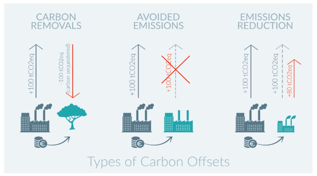 โครงการชดเชยคาร์บอนบางประเภท เช่น โครงการเกษตรวนศาสตร์ที่ปลูกต้นไม้ สามารถดึง CO2 ออกจากชั้นบรรยากาศได้ อย่างน้อยในช่วงเวลาหนึ่ง อย่างไรก็ตาม โครงการชดเชยส่วนใหญ่ไม่ได้ลดการปล่อยก๊าซเรือนกระจกหรือกำจัด CO2 เพิ่มเติมจากชั้นบรรยากาศ ตัวอย่างคือโครงการที่มุ่งหลีกเลี่ยงการปล่อยก๊าซ เช่น โครงการปกป้องป่าไม้ (การหลีกเลี่ยงการตัดไม้ทำลายป่า) โครงการชดเชยคาร์บอนหลายโครงการมุ่งลดการปล่อยก๊าซเรือนกระจก แต่ไม่ได้ดึง CO2 ออกจากชั้นบรรยากาศ เช่น โครงการพลังงานแสงอาทิตย์ที่แทนที่พลังงานจากเชื้อเพลิงฟอสซิล หรือโครงการเตาทำอาหารที่สะอาดซึ่งลดการเผาไหม้ไม้และถ่าน (แหล่งที่มา: Sophie Scherger, Institute for Agriculture and Trade Policy, Carbon farming: How big corporations are driving the EU’s carbon removals agenda, Figures 1 & 2, pp.4-5, 2022)