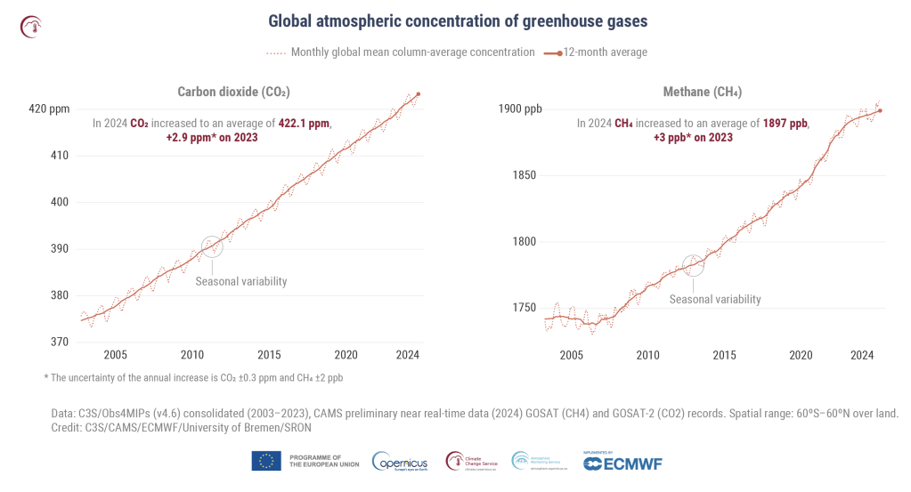 - ความเข้มข้นของก๊าซคาร์บอนไดออกไซด์และมีเทนในบรรยากาศยังคงเพิ่มขึ้นและทำสถิติสูงสุดรายปีในปี 2024 โดยความเข้มข้นของคาร์บอนไดออกไซด์อยู่ที่ 422 ส่วนในล้านส่วน (ppm) และมีเทนอยู่ที่ 1897 ส่วนในพันล้านส่วน (ppb) ความเข้มข้นของคาร์บอนไดออกไซด์ในปี 2024 สูงกว่าปี 2023 2.9 ppm ในขณะที่ความเข้มข้นของมีเทนสูงขึ้น 3 ppb.