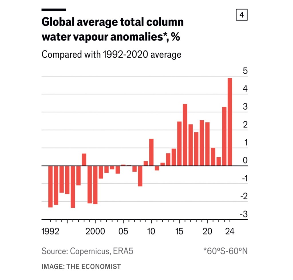 โดยเฉลี่ยแล้ว เอลนีโญทำให้บรรยากาศชื้นขึ้น (แม้ว่าจะทำให้บางพื้นที่ประสบกับภัยแล้งได้เช่นกัน) แผนภูมิที่ 4 แสดงความแปรผันของปริมาณไอน้ำในบรรยากาศในแต่ละปี จะเห็นได้อีกครั้งว่ามีทั้งแนวโน้มการร้อนขึ้นโดยรวมและผลกระทบเฉพาะของเอลนีโญ ซึ่งทั้งสองปัจจัยนี้มีส่วนทำให้ปี 2024 กลายเป็นปีที่สร้างสถิติใหม่