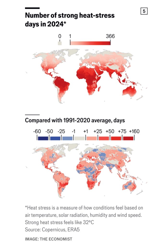 ผลกระทบของความร้อนต่อสุขภาพมนุษย์จะแย่ลงเมื่อบรรยากาศมีความชื้นสูง ในแง่ของ “ความเครียดจากความร้อน” (heat stress) แบบผสม ปี 2024 ถือเป็นปีที่เลวร้าย มาตรการทางการกำหนดว่า “ความเครียดจากความร้อนระดับรุนแรง” คืออุณหภูมิที่ “รู้สึกเหมือน” 32ºC หรือมากกว่า แผนภูมิที่ 5 แสดงจำนวนวันที่โลกเผชิญกับสภาวะดังกล่าว ในวันที่ 10 กรกฎาคม พื้นที่ประมาณ 44% ของโลกได้รับผลกระทบจาก “ความเครียดจากความร้อนระดับรุนแรงหรือระดับสุดขีด” ซึ่งเป็นสถิติโลกใหม่