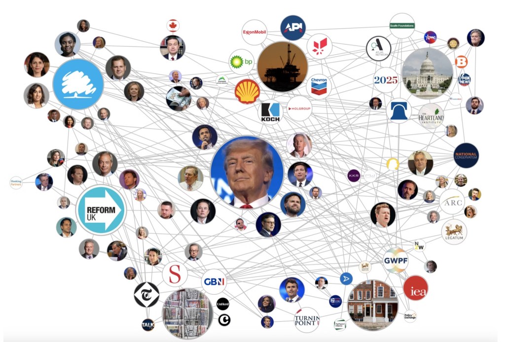 ตามที่ DeSmog รายงานในวันนี้ (ซึ่งรวบรวมไว้ในแผนที่เชิงโต้ตอบ) ทรัมป์และมัสก์ ได้รับการสนับสนุนจากเครือข่ายที่มีเงินทุนหนาแน่นในสหราชอาณาจักร ซึ่งประกอบด้วยนักการเมือง สถาบันวิชาการ สื่อ และผู้บริจาคทางการเมือง ที่กำลังผลักดันวาระที่สนับสนุนเชื้อเพลิงฟอสซิลและต่อต้านนโยบายด้านสภาพภูมิอากาศ