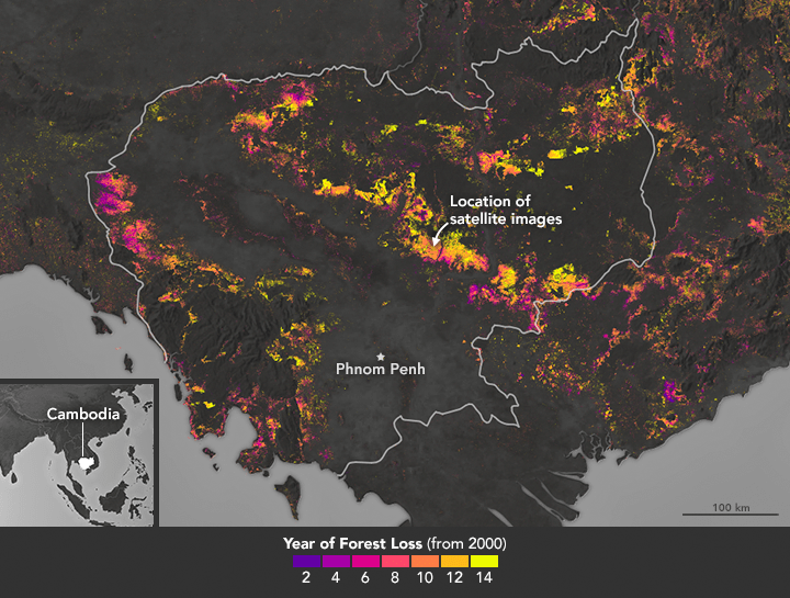 ข้อมูลจาก Global Forest Watch ระบุว่า กัมพูชาเป็นหนึ่งในประเทศที่มีอัตราการทำลายป่าไม้เร็วที่สุดในโลก ในภาพรวมของประเทศ ภูมิทัศน์ที่มีป่าไม้หนาแน่น —รวมถึงในพื้นที่ป่าอนุรักษ์—ถูกแผ้วถางเพื่อเป็นพื้นที่สวนยางและอุตสาหกรรมตัดไม้ขนาดใหญ่