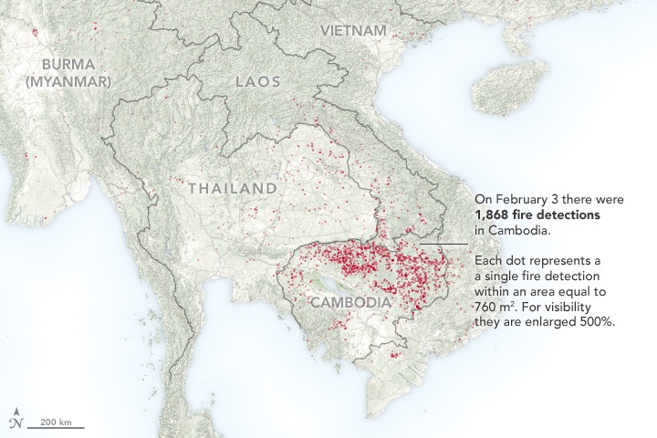 ระหว่างเดือนมกราคมถึงมีนาคมของทุกปี เป็นช่วงการเกิดไฟทั่วทั้งพื้นที่ต่างๆ ในอาเซียนตอนบน ช่วงเวลาดังกล่าวนี้มีอากาศแห้งซึ่งเป็นเงื่อนไขที่พอเหมาะในการเกิดไฟ โดยพื้นที่การเกิดไฟที่โดดเด่นหนึ่งในนั้นก็คือกัมพูชา การวิเคราะห์โดยการตรวจจับจุดความร้อนจำนวนมากในกัมพูชาโดยภาพถ่ายดาวเทียมชี้ให้เห็นถึงความเชื่อมโยงกับพื้นที่ป่าไม้ที่สูญเสียไป(forest cover loss) ไฟที่เกิดมากขึ้นในแต่ละปี พื้นที่ป่าไม้ก็สูญเสียมากตามไปด้วย