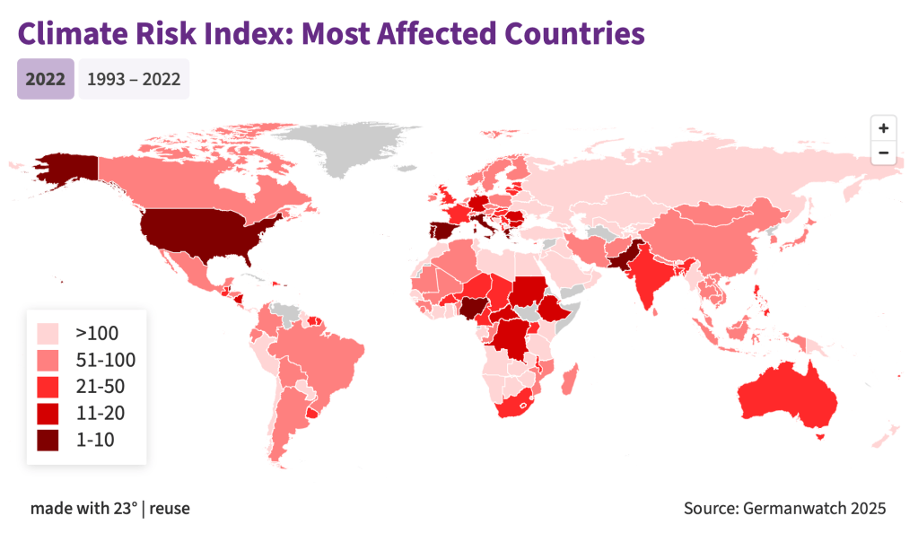 ระหว่างปี 1993 ถึง 2022 มีผู้เสียชีวิตมากกว่า 765,000 คน และมีความสูญเสียทางเศรษฐกิจโดยตรงเกือบ 4.2 ล้านล้านดอลลาร์สหรัฐ (ปรับตามอัตราเงินเฟ้อ) ซึ่งเกิดจากเหตุการณ์สภาพอากาศสุดขั้วมากกว่า 9,400 ครั้ง ความถี่และความรุนแรงของภัยพิบัติที่เกี่ยวข้องกับสภาพภูมิอากาศยังคงเพิ่มขึ้นอย่างต่อเนื่อง ตัวเลขเหล่านี้ตอกย้ำถึงความจำเป็นเร่งด่วนในการดำเนินมาตรการด้านสภาพภูมิอากาศอย่างจริงจัง