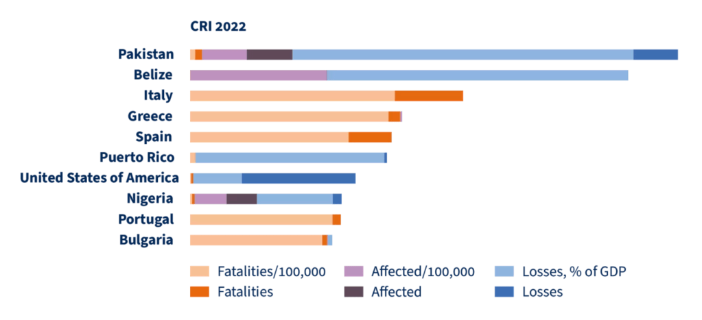 - ในปี 2022 ประเทศที่ได้รับผลกระทบมากที่สุดคือ ปากีสถาน (Pakistan), เบลีซ (Belize), และอิตาลี (Italy)