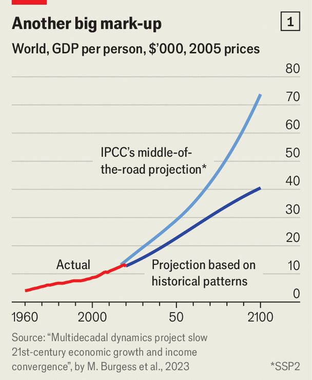 อีกหนึ่งปัญหาของแบบจำลองคือข้อสมมติเกี่ยวกับการเติบโตทางเศรษฐกิจ Matt Burgess จากมหาวิทยาลัยไวโอมิงและเพื่อนร่วมงานสังเกตว่า การคาดการณ์ของ IPCC มักจะประเมินการเติบโตทางเศรษฐกิจเกินจริงในทั้งโลกที่ร่ำรวยและโลกที่ยากจน พวกเขาเสนอว่ากรณีที่เลวร้ายที่สุดสำหรับการเติบโตทางเศรษฐกิจใน “Shared Socioeconomic Pathways” (SSPs) ที่ IPCC ใช้ในแบบจำลองนั้น น่าจะเป็นสถานการณ์ที่ดีในแง่ของกรณีที่ดีที่สุดแทน พวกเขาทำนาย GDP ต่อคนโดยอิงจากความสัมพันธ์ในอดีตระหว่างระดับสัมบูรณ์และอัตราการเติบโต ซึ่งให้ผลการคาดการณ์ที่ต่ำกว่าของ SSP2 ซึ่งถูกมองว่าเป็นสถานการณ์ “กลางๆ” (ดูแผนภูมิที่ 1)