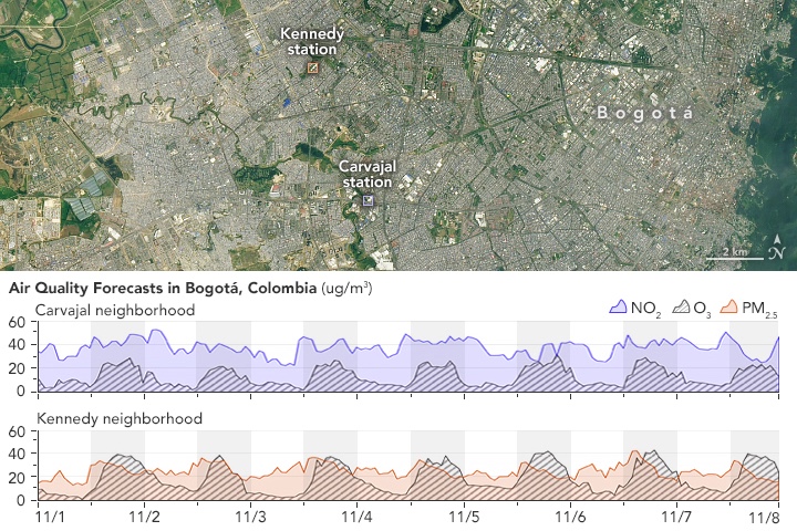 แผนภูมิด้านบนสุด แสดงตัวอย่างพยากรณ์ ไนโตรเจนไดออกไซด์ (NO2) และโอโซน (O3) จากโครงการ CityAQ ซึ่งออกเมื่อวันที่ 4 พฤศจิกายน 2023 หลังจากที่แบบจำลองได้รับการฝึกโดยใช้ข้อมูลจากย่าน คาร์วาฆาล (Carvajal) ของโบโกตา เนื่องจากสถานีตรวจวัดนี้ตั้งอยู่ใกล้ทางหลวงขนาดใหญ่และแหล่งอุตสาหกรรม จึงมักบันทึกค่าความเข้มข้นของ NO2 รายปีสูงสุด ในบรรดาสถานีตรวจวัดทั้งหมดของเมือง และมักเกินค่ามาตรฐานของ องค์การอนามัยโลก (WHO) ทั้งสำหรับ NO2 และ PM2.5 แผนภูมิที่สอง แสดงผลลัพธ์ของ โอโซน (O3) และ PM2.5 สำหรับย่าน เคนเนดี (Kennedy) ซึ่งอยู่ใกล้เคียง