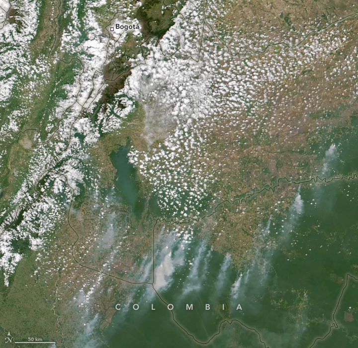 ภาพด้านล่างซึ่งถ่ายโดย VIIRS (Visible Infrared Imaging Radiometer Suite) บนดาวเทียม Suomi NPP ของ NASA-NOAA แสดงตัวอย่างไฟป่าตามฤดูกาลที่ลุกไหม้ทางตอนใต้และตะวันออกของเมือง เมื่อวันที่ 28 มกราคม 2022 ก่อนที่กระแสลมจะเปลี่ยนทิศและพัดพาควันเข้าสู่โบโกตา