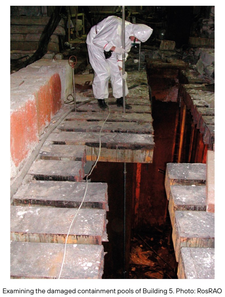 จากการศึกษาที่ได้รับการสนับสนุนโดยธนาคารยุโรปเพื่อการบูรณะและพัฒนา (EBRD) พบว่าที่ก้นของสระกักกันทั้งสี่แห่ง มีผลิตภัณฑ์จากการกัดกร่อนที่มีระดับกัมมันตภาพรังสีสูงและปานกลางเป็นจำนวนมาก (ประมาณ 35 ลูกบาศก์เมตร รวมกัมมันตภาพรังสีประมาณ 2,500 เคียวรี) ซึ่งรวมถึงวัตถุประมาณ 400 ชิ้นที่จัดอยู่ในประเภทกากกัมมันตรังสีของแข็งระดับปานกลางถึงสูง ชุดเชื้อเพลิงใช้แล้ว 6 ชุด และเศษชิ้นส่วนของแท่งเชื้อเพลิงปริมาณไม่แน่ชัด