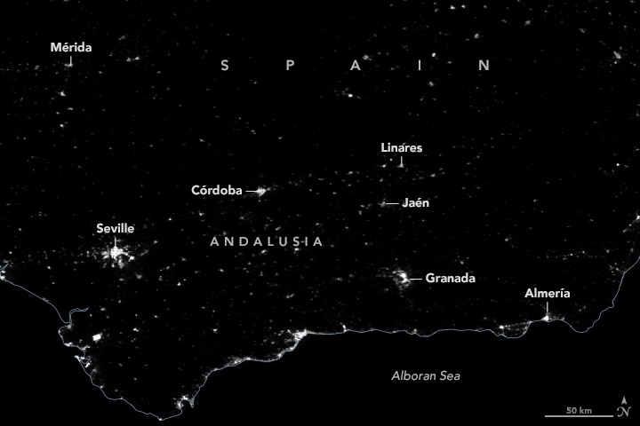จากการวิเคราะห์ข้อมูลจากผลิตภัณฑ์ Black Marble ชเรสธา (Shrestha) สังเกตว่าแสงไฟส่วนใหญ่ในเขตเมืองทั่วคาบสมุทรไอบีเรียเริ่มกลับมาสว่างอีกครั้งภายในวันที่ 29 เมษายน อย่างไรก็ตาม เขาชี้ให้เห็นว่าพื้นที่ชนบท โดยเฉพาะในแคว้นอันดาลูเซีย และบริเวณทางตอนใต้และตะวันออกของจังหวัดกรานาดา (ตามภาพด้านบน) ยังคงมืดสนิท