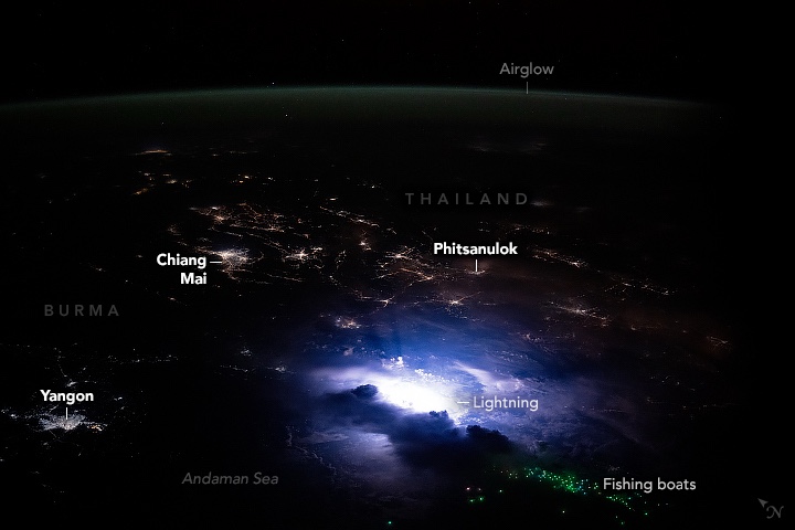 นักบินอวกาศบนสถานีอวกาศนานาชาติได้ถ่ายภาพยามค่ำคืนภาพนี้ขณะโคจรอยู่เหนือทะเลอันดามันในภูมิภาคเอเชียตะวันออกเฉียงใต้ ด้านหน้าเป็นแสงฟ้าแลบจากพายุฝนฟ้าคะนองที่สว่างวาบใกล้กับเรือประมงนอกชายฝั่งเมืองย่างกุ้ง ซึ่งเป็นเมืองใหญ่ที่สุดของพม่า (เมียนมา) มุมมองจากสถานีอวกาศนี้แสดงให้เห็นภูมิภาคที่มีผู้คนอาศัยอยู่หนาแน่น ซึ่งเป็นบริเวณที่พม่า (เมียนมา) ไทย และลาว มีพรมแดนติดต่อกัน