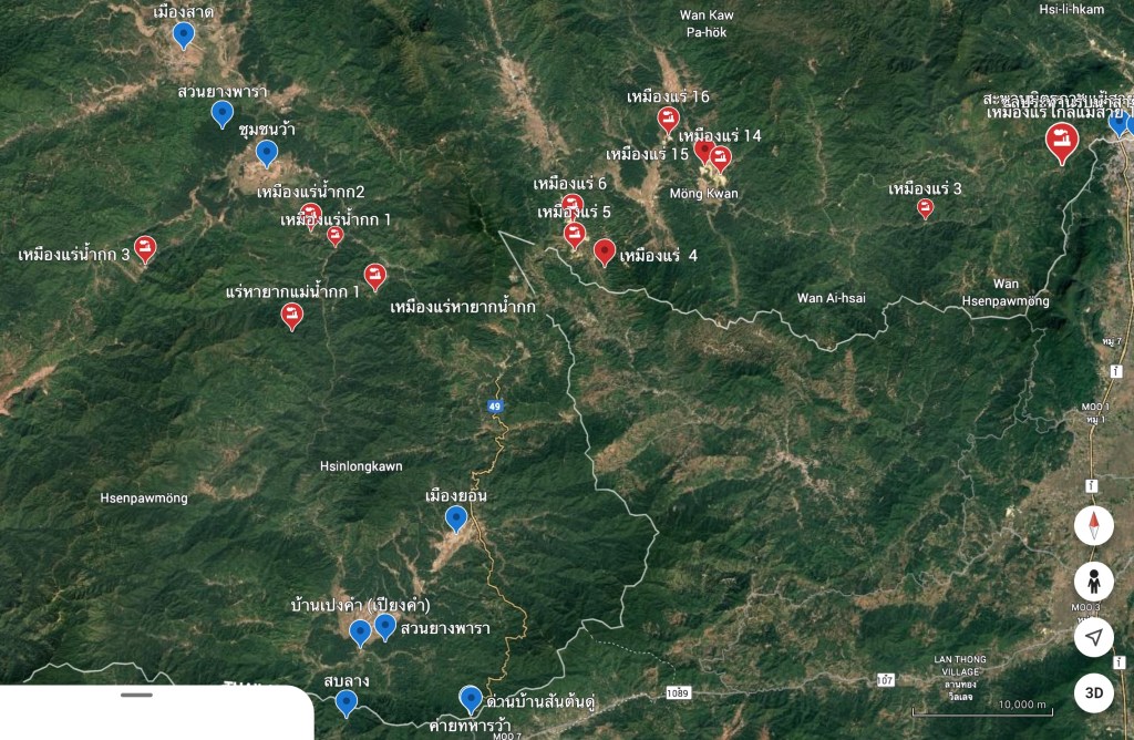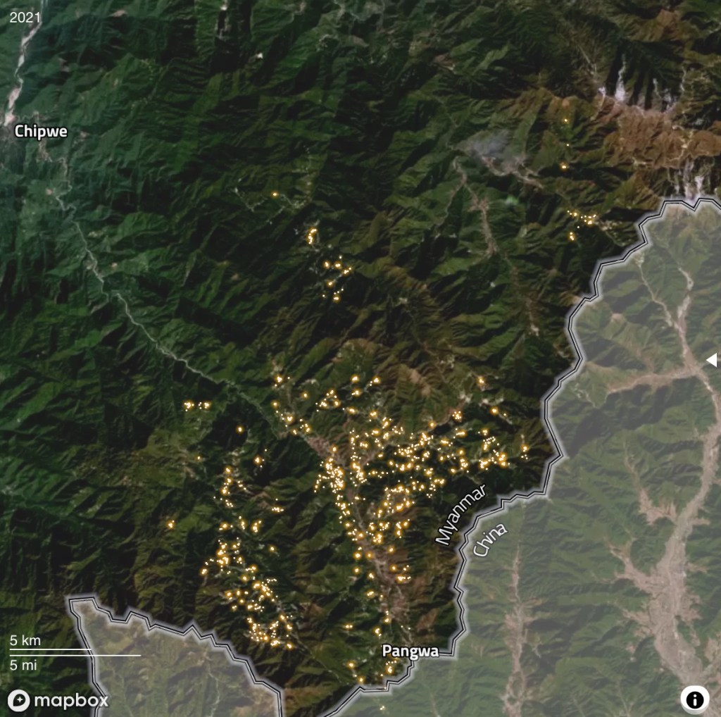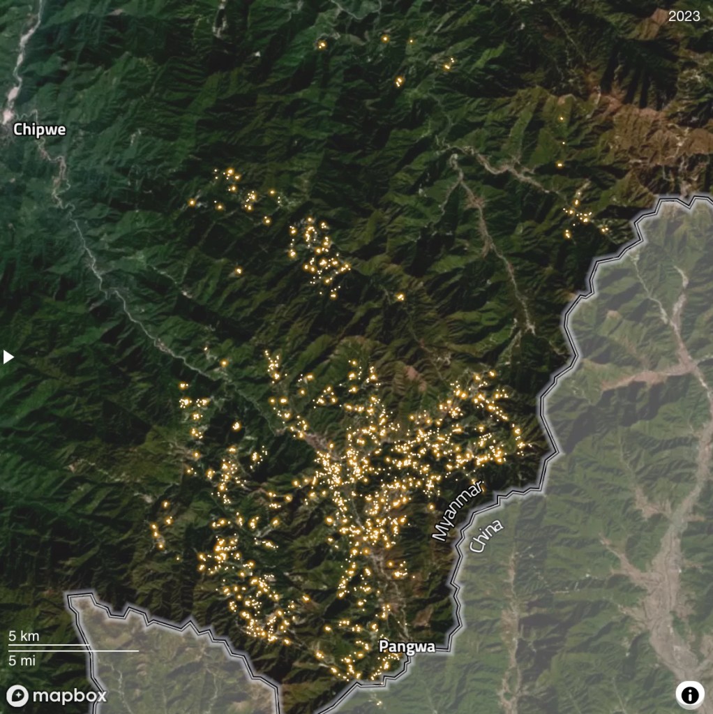 ข้อมูลจาก Global Witness ซึ่งเปิดเผยก่อนหน้านี้ถึงความเฟื่องฟูของการทำเหมืองแร่แรร์เอิร์ธหนัก (HREE) ในเขตปกครองพิเศษกะฉิ่นที่ 1 ซึ่งอยู่ภายใต้การควบคุมของกลุ่มติดอาวุธที่ภักดีต่อกองทัพเมียนมา ภาพถ่ายดาวเทียมแสดงให้เห็นว่า จำนวนแหล่งเหมืองในพื้นที่ดังกล่าวเพิ่มขึ้นมากกว่า 300 แห่ง เพิ่มขึ้นกว่า 40% ระหว่างปี 2021 ถึง 2023 จนกระจายแน่นหนาไปทั่วภูมิประเทศรอบเมืองชายแดนปางวา