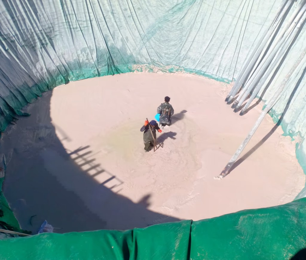 คนงานทำงานกับกรดออกซาลิก — สารเคมีพิษที่ใช้ในการแปรสภาพแร่แรร์เอิร์ธหลังจากถูกชะละลายจากภูเขาแล้ว กระบวนการนี้เริ่มจากจุดสูงเหนือบ่อรวมน้ำ โดยมีการฉีดแอมโมเนียมซัลเฟตลงสู่พื้นดินผ่านเครือข่ายท่อ เมื่อสารละลายไหลลงมาตามแนวลาด มันจะละลายธาตุแรร์เอิร์ธออกมาด้วย แต่ในขณะเดียวกันก็สร้างผลกระทบร้ายแรงต่อสิ่งแวดล้อม